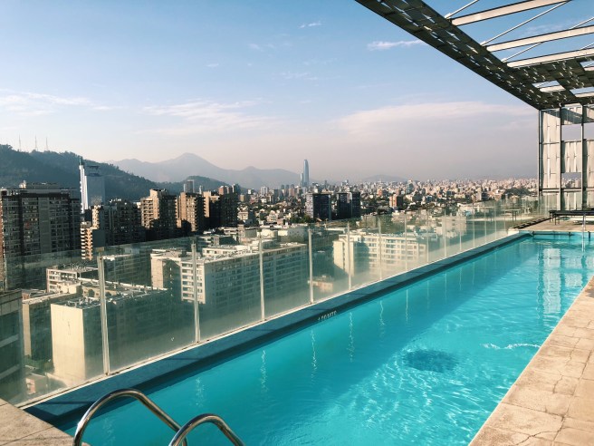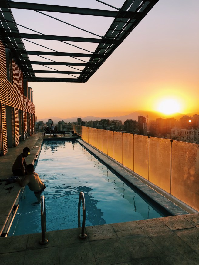 In hindsight, the highlight of our day was undoubtedly lounging by our airbnbs rooftop pool! It consisted of 1 long pool, and 2 tinier pools, perfect for laps or just cooling off. It also boasted an amazing view of Santiago’s concrete jungle! We were lucky it was hot enough that a dip in the pool was refreshing, and we were also able to watch a beautiful sunset! Something we didn’t expect, because we were told Chile would be cooler in April.